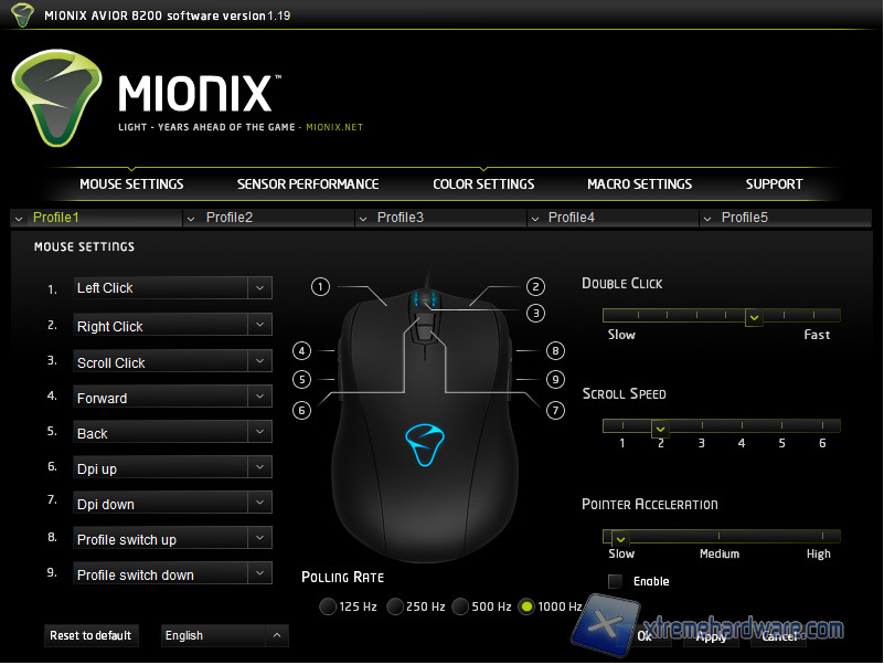 Mouse Setting è la prima schermata che ci appare davanti aperto il tool di configurazione, da qui principalmente possiamo mappare i 9 pulsanti programmabili del mouse, potendo scegliere tra le funzioni tipiche di un mouse, switch dei profili o della risoluzione del sensore, assegnazione di un singolo tasto o di una macro e l'inibizione del tasto stesso. È presente anche il controllo del polling rate oltre che all'accelerazione del mouse, velocità dello scroll e del doppio click. Da notare, infine, la possibilità di gestire 5 profili.