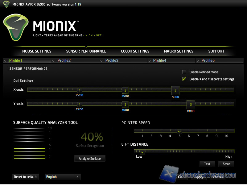 Sensor performance ci permette invece di regolare i parametri dell'Avago 9800, è possibile configurare i tre step di risoluzione attraverso i 3 cursori (1-2-3), anche ad assi indipendente. Un aspetto interessante è il tool di analisi della superficie, inoltre, è presente il controllo del Lift OFF e della velocità del puntatore. Una features insolita è la Refined mode, che cambia leggermente il comportamento del mouse tanto da far pensare ad un lieve aumento della risoluzione per capirci. Dal punto di vista semantico ci verrebbe da pensare che tale features aumenti in qualche modo la precisione del sensore, tuttavia anche il tool di analisi della superficie non mostra cambiamenti di sorta nelle due modalità (on o off).