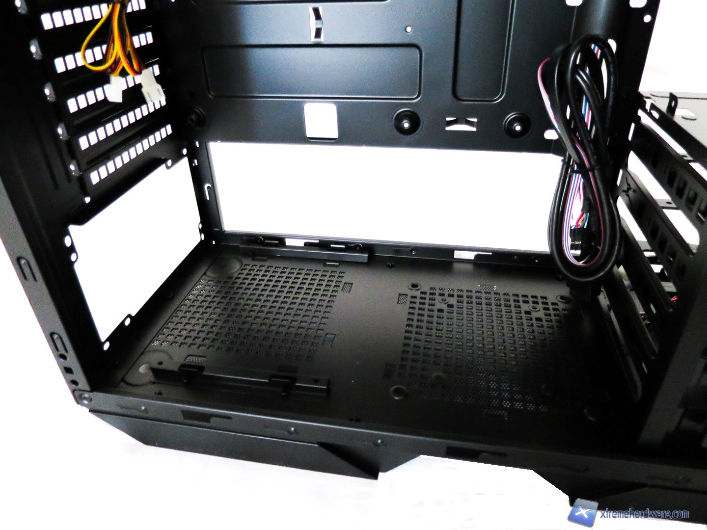 Spostandoci verso la zona inferiore troviamo lo spazio necessario ad installare l’alimentatore e con un adeguato cablaggio anche un’eventuale ventola da 120mm aggiuntiva. Il cablaggio inferiore è in parte agevolato anche da un’apertura orizzontale che darà meglio modo di organizzare i cavi. Ovviamente in presenza di alimentatori più lunghi dello standard ATX l’installazione della ventola non sarà possibile.
