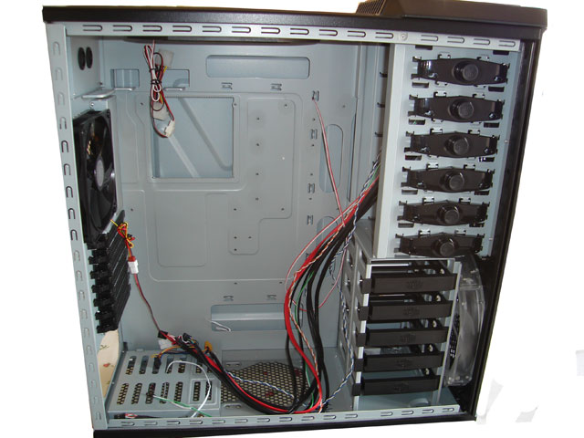 La parte interna secondo noi è il pezzo forte di questo prodotto, ogni cavo sarà al suo posto grazie ad un attento lavoro degli ingegneri cooler master, sul tray della scheda madre sono presenti numerosi fori per nascondere sia i cavi più piccoli (sata, molex, fili delle ventole, ecc ecc) sia per il cavo di alimentazionea 24pin della mobo; in ogni sezione del case è presente una scanalatura per introdurvi i cavi: nella parte superiore per le ventole,di lato per i collegamenti degli hard disk ed unità ottiche e nella parte inferiore per posizionare tutti i cavi inutilizzati dell’alimentatore. Non servirà per forza acquistare un psu modulare in quanto con un po’ di pazienza riuscirete a nascondere tutti i cavi in maniera tale da avere un ottimo risultato sia visivo che funzionale per non ostacolare i flussi d’aria all’interno dell’haf932.