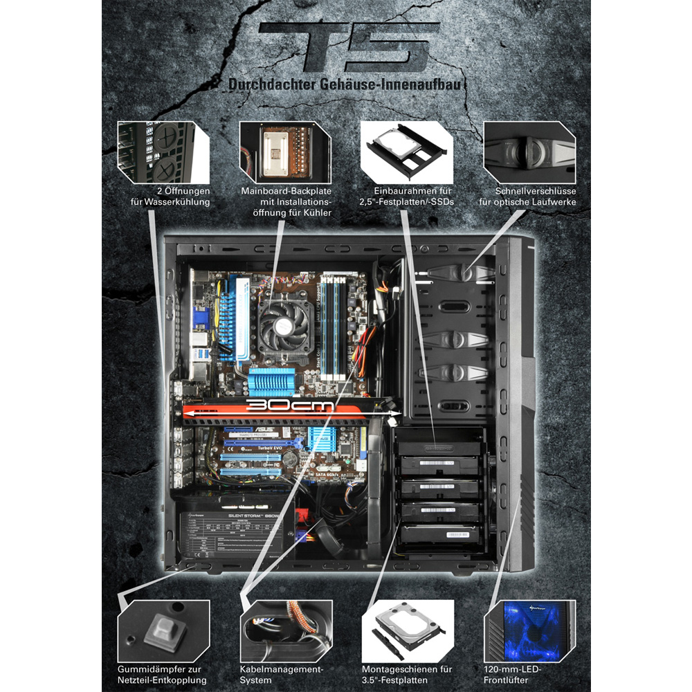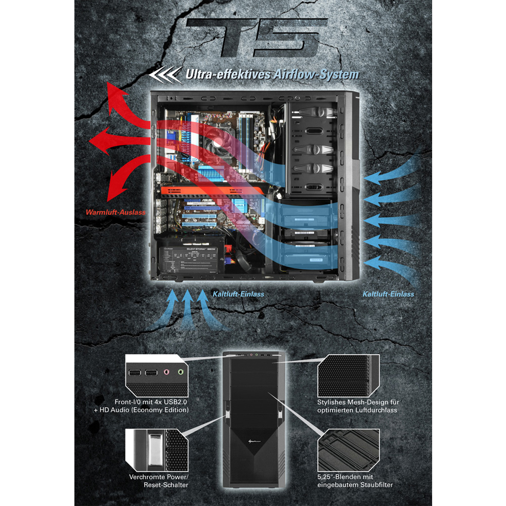 In questi due riquadri notiamo come viene gestito il flusso d’aria all’interno del case; nell’altra immagine vengono raffigurate alcune caratteristiche del T5 Value Edition.
