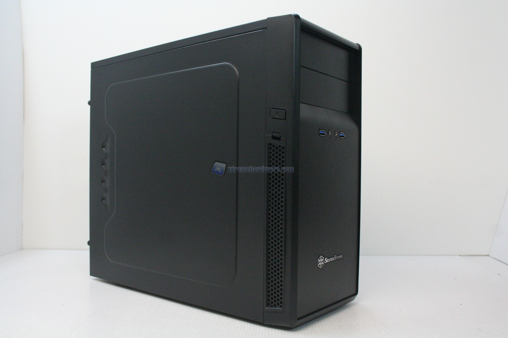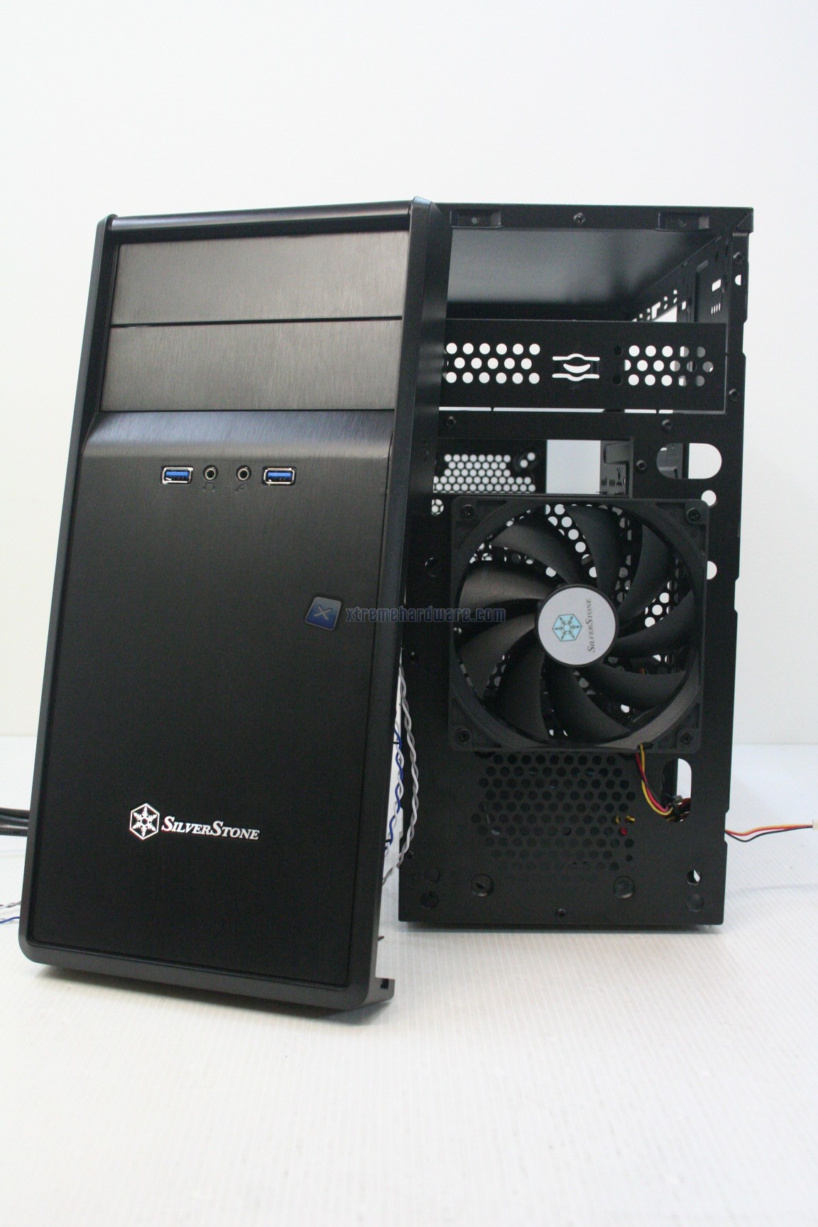 La versione che abbiamo ricevuto è l’unica in commercio ovvero integralmente nera. L’impressione iniziale è mista. Da una parte le dimensioni complessive giocano a favore dell’unità, che oltretutto è leggerissima, dall’altra l’utilizzo di plastiche nel frontale può far storcere il naso a più di qualcuno. Comunque sia, le plastiche sono rigide ed il telaio del chassis è in acciaio. Precisiamo che lo spessore delle paratie è elementare, diversamente da molti altri modelli SilverStone di fasce più alte di prezzo, ma appunto è proprio questo l’elemento da tenere in forte considerazione. Nel complesso, sebbene non presenti la solita qualità SilverStone, si può rimanere soddisfatti. Le linee artistiche sono eleganti ed è presenta una finitura in finto acciaio spazzolato. In compenso la verniciatura delle paratie è ottima, uniforme e nient’affatto scadente nemmeno all’interno, come invece succede in molti altri modelli della concorrenza. Oltre al fumo quindi, in questo caso, troviamo anche dell’arrosto (alle due di notte, orario in cui sto scrivendo, parlare di arrosto mi ha fatto venire abbastanza fame. Se poi consideriamo che i due revisori tecnici, mozart e luna, stanno diventando terribilmente simili a cognigli da forno, per via del loro crescente peso, l’attacco famelico del recensore notturno si fa sentire ! ). D’accordo, mettiamo da parte l’arrosto e andiamo al succo, o meglio, al contenuto. Insomma, procediamo!