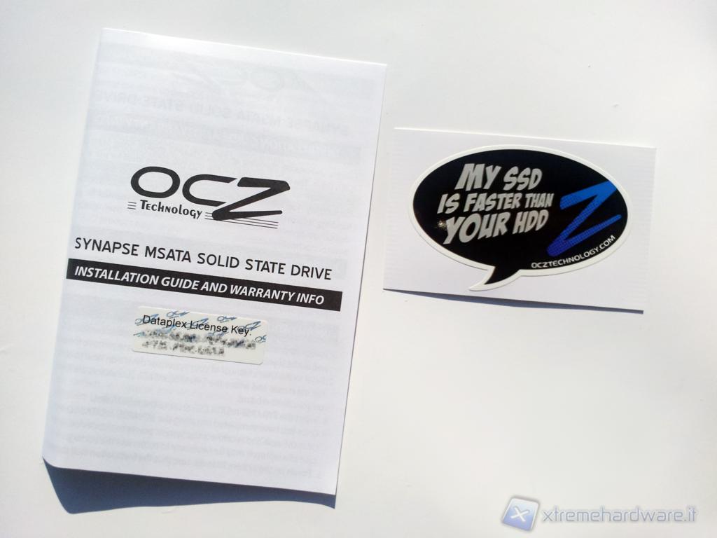 Anche la confezione interna e il contenuto è rimasto invariato, sul manuale di installazione e di garanzia è presente anche il codice di licenza per il software NVELODataplex (che oscuriamo per ovvie ragioni) mentre è presente, come per gli altri drive OCZ, il simpatico adesivo riportante la scritta "My SSD isfasterthanyour HDD" anche se in questo caso non è proprio giusta in quanto il nostro HDD, proprio grazie all'utilizzo del Synapse, potrà diventare, in determinate circostanze, più veloce di un SSD Sata II ed in alcuni casi competere potrà con SSD Sata III top di gamma.